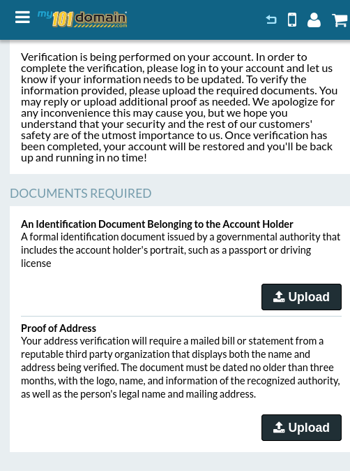 Verification is being performed on your account. In order to complete the verification, please log in to your account and let us know if your information needs to be updated. To verify the information provided, please upload the required documents. You may reply or upload additional proof as needed. We apologize for any inconvenience this may cause you, but we hope you understand that your security and the rest of our customers' safety are of the utmost importance to us. Once verification has been completed, your account will be restored and you'll be back up and running in no time!